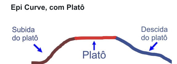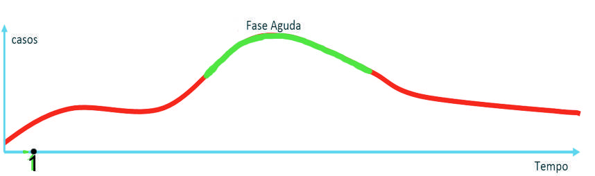O gráfico mostara na vertical o número de casos, inicialmente temos a curva alta. Ao serem tomadas medidas de controle,