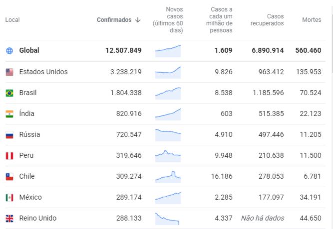 Curva Epidêmica do Número de Casos de Covid-19, do Brasil Gráficos: Google Previsão/chute: o Brasil vai atingir o platô, e não um pico simples, em algumas semanas (hoje é 26/jun).