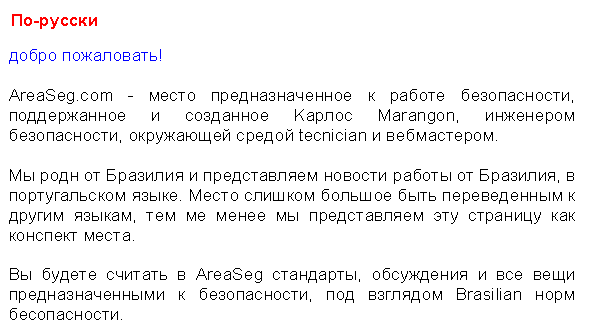 AreaSeg.com - areasafety is a site dedicated to Safety Work, maintained and created by Carlos Marangon, safety engineer, environment tecnician and webmaster. We are native from Brazil and present work news from Brazil, in Portuguese language. Site is too large to be translated to other languages, however we present this page as an abstract of the site You will find in AreaSeg the standards, discussions and all things dedicated to Safety, under the view of Brasilian safety standards. |